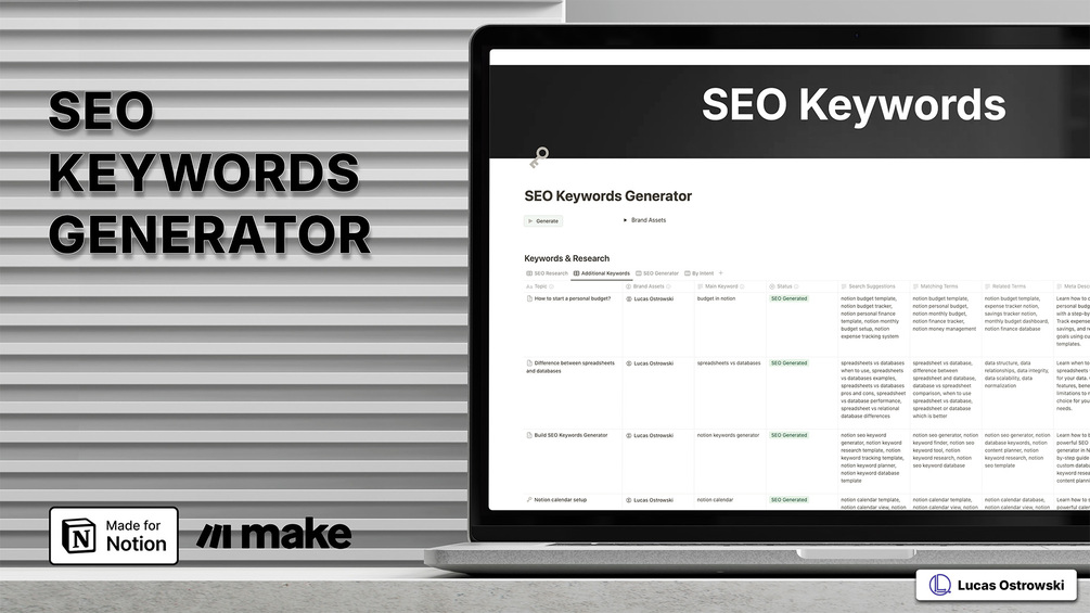 Supercharge your SEO with our Notion-based Keyword Generator. Uncover valuable keywords, search suggestions, and related terms. The paid upgrade automates meta descriptions and SEO-ready permalinks—empowering you to rank higher and faster.